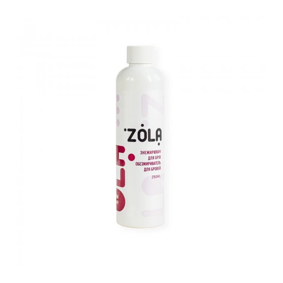 Бренд Zola розробив серію засобів для професійного догляду за бровами. Перший крок – це надання шкірі в навколобровній зоні гладкості за допомогою скрабу для більш рівномірного фарбування. Другий – очищення спеціальним шампунем для брів. Третій крок – знежирення. Тут ідеальний помічник – засіб для знежирення Zola, який не містить H2O і сприяє усуненню залишків себуму, гарантуючи ідеально рівний тон після фарбування. Знежирювач підходить і для професійного застосування, і для домашнього фарбування.