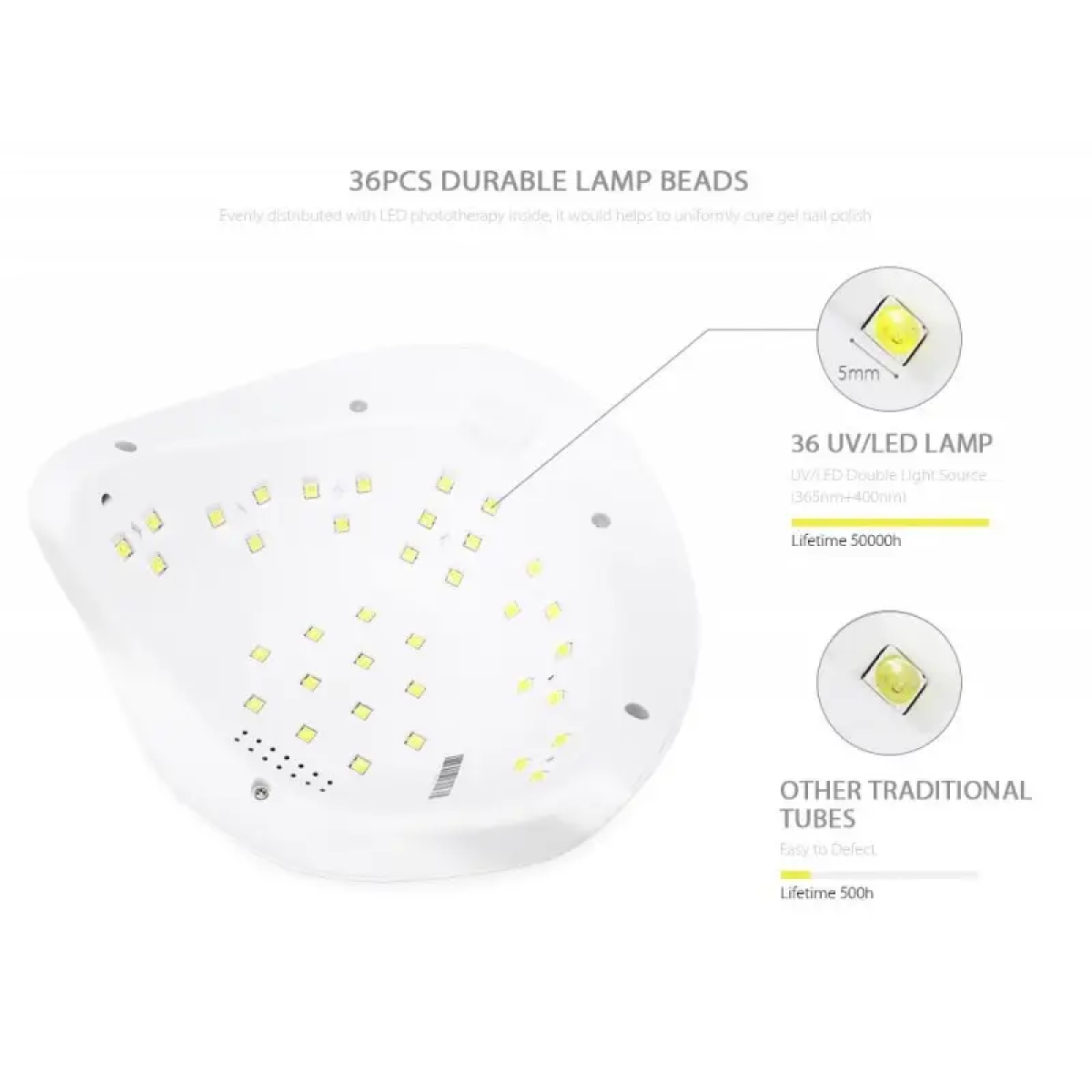 Внутренняя камера лампы просторная, что удобно как для маникюрных, так и для педикюрных процессов. Верхняя панель имеет четыре кнопки таймера и дисплей.