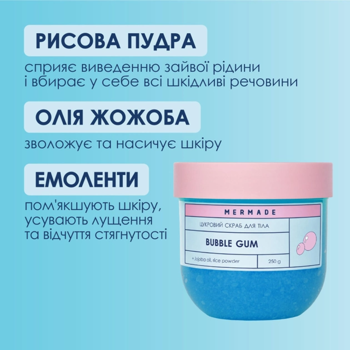Іноді швидкий ритм життя = мінімум часу на домашній догляд. Але і в цей мінімум можна вкласти вдалий мікс турботи про себе. З цукровим скрабом для тіла Mermade Bubble Gum ти отримаєш чисту і гладку шкіру, а соковитий фруктовий запах додатково зарядить сонячним настроєм!
