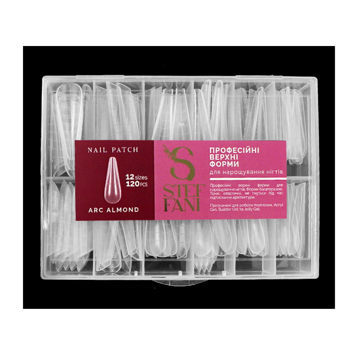 ВЕРХНІ ФОРМИ ДЛЯ НАРОЩУВАННЯ НІГТІВ STEFFANI NAIL PATCH ARC ALMOND. АРКОВИЙ МИГДАЛЬ. З РОЗМІТКОЮ. ПРОЗОРІ. 120
