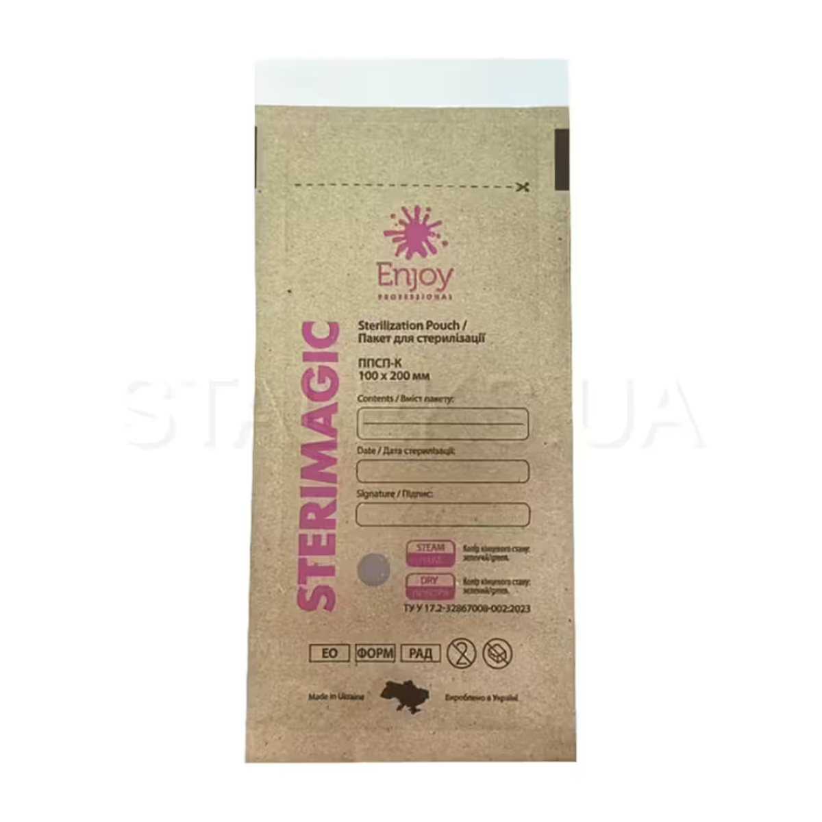 Одноразові крафт-пакети Enjoy SteriMagiс виготовлені зі спеціального паперу та призначені для стерилізації, паковання та зберігання інструментів. Знезараження з ними може бути проведено в сухожилля, автоклаві або газовим методом. Така обробка інструментів створює захист від мікробів на 60 днів. Кожен із пакетів має індикатор 1 класу для визначення якості проданої процедури. Він змінює забарвлення з фіолетовою на зелену під час різних видів обробки: під час стерилізації в сухожаровій шафі повітряним методом і під час очищення в автоклаві паровим методом. Завдяки наявності такого показника і майстер, і клієнт можуть бути спокійні та впевнені в чистоті та стерильності інструмента.
