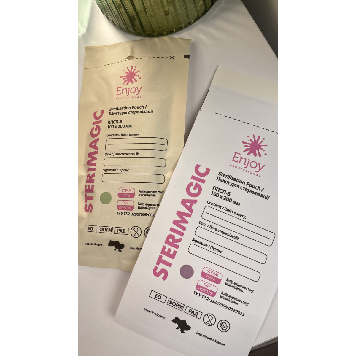 Одноразові крафт-пакети Enjoy SteriMagiс виготовлені зі спеціального паперу та призначені для стерилізації, пакування і зберігання інструментів. Знезараження з ними може бути проведене в сухожарі, автоклаві чи газовим методом. Така обробка інструментів створює захист від бактерій на 60 днів. Кожен із пакетів має індикатор 1 класу для визначення якості проведеної процедури. Він змінює забарвлення з фіолетового на зелене при різних видах обробки: при стерилізації в сухожаровій шафі повітряним методом і при очищенні в автоклаві паровим методом. Завдяки наявності такого показника і майстер, і клієнт можуть бути спокійні та впевнені в чистоті й стерильності інструментів.