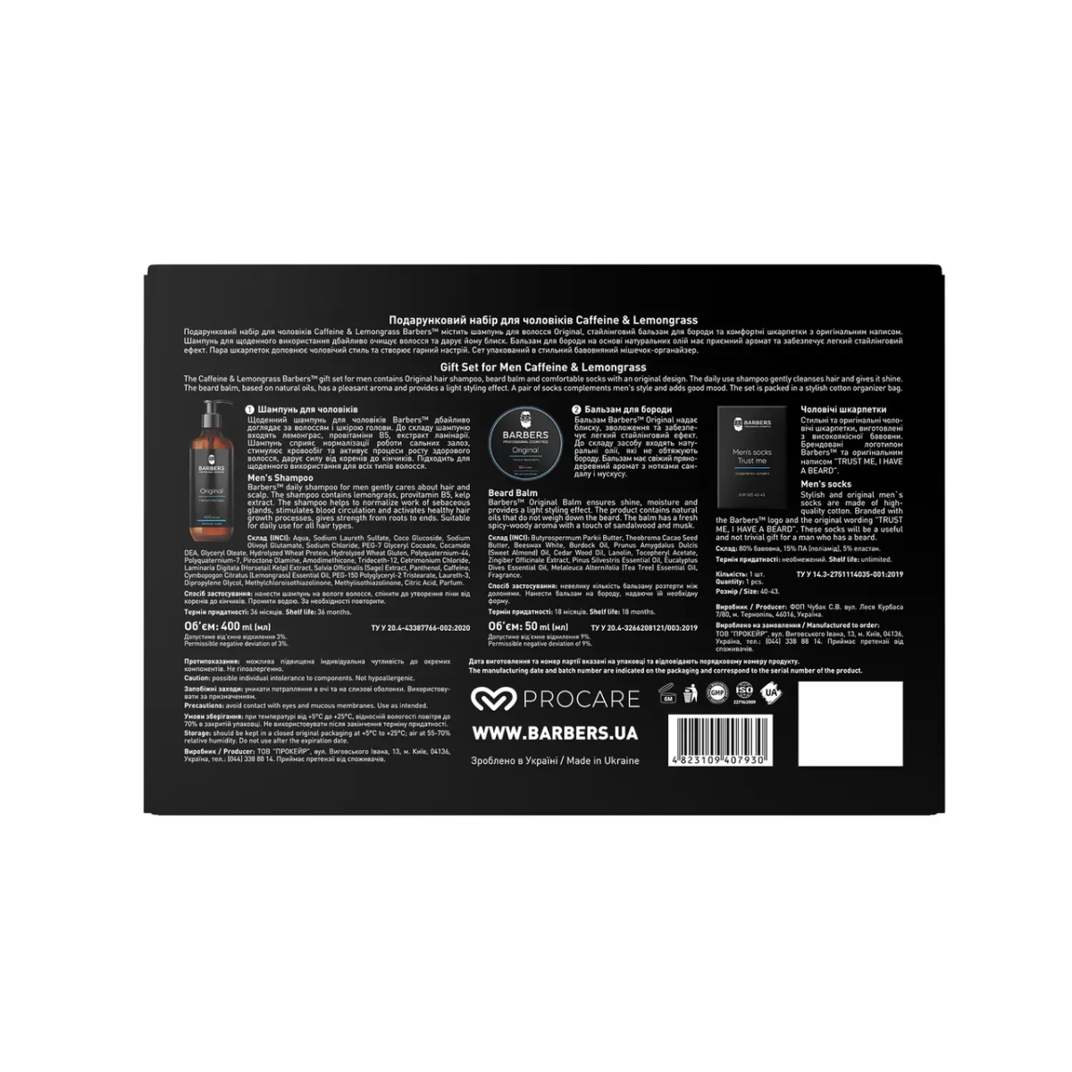 Подарунковий набір для чоловіків Caffeine & Lemongrass Barbers™ містить шампунь для волосся Original, стайлінговий бальзам для бороди та комфортні шкарпетки з оригінальним написом. Шампунь для щоденного використання дбайливо очищує волосся та дарує йому блиск. Бальзам для бороди на основі натуральних олій має приємний аромат та забезпечує легкий стайлінговий ефект. Пара шкарпеток доповнює чоловічий стиль та створює гарний настрій. Сет упакований в стильний бавовняний мішечок-органайзер.
