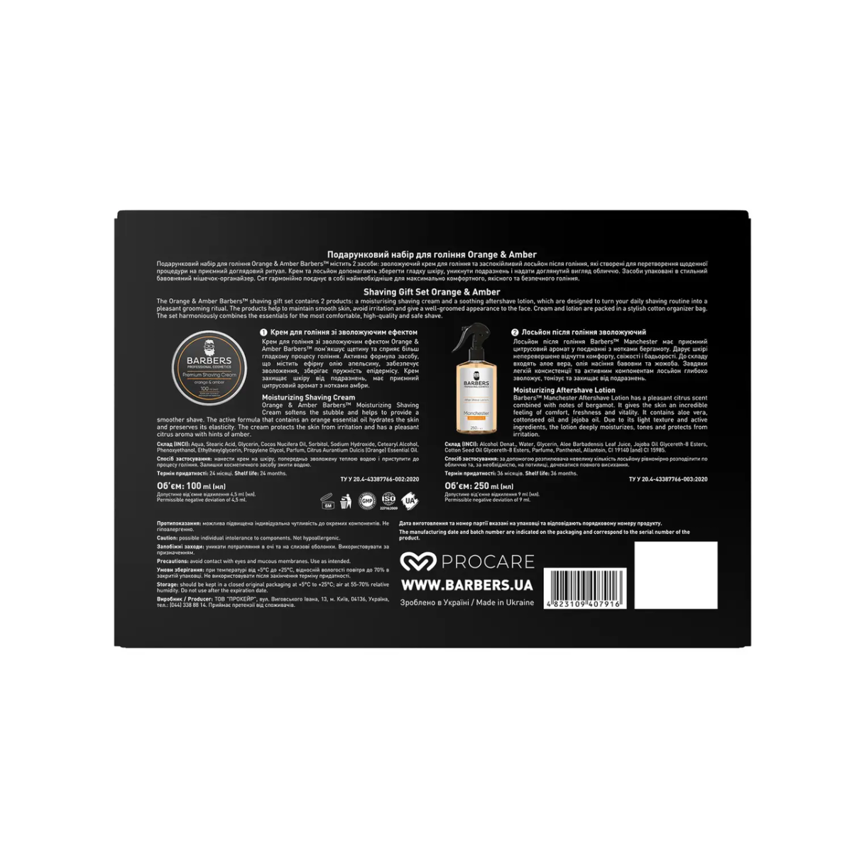 Подарунковий набір для гоління Orange & Amber Barbers™ містить 2 засоби: зволожуючий крем для гоління та заспокійливий лосьйон після гоління, які створені для перетворення щоденної процедури на приємний доглядовий ритуал. Крем та лосьон допомагають зберегти гладку шкіру, уникнути подразнень і надати доглянутий вигляд обличчю. Засоби упаковані в стильний бавовняний мішечок-органайзер. Сет гармонійно поєднує в собі найнеобхідніше для максимально комфортного, якісного та безпечного гоління.