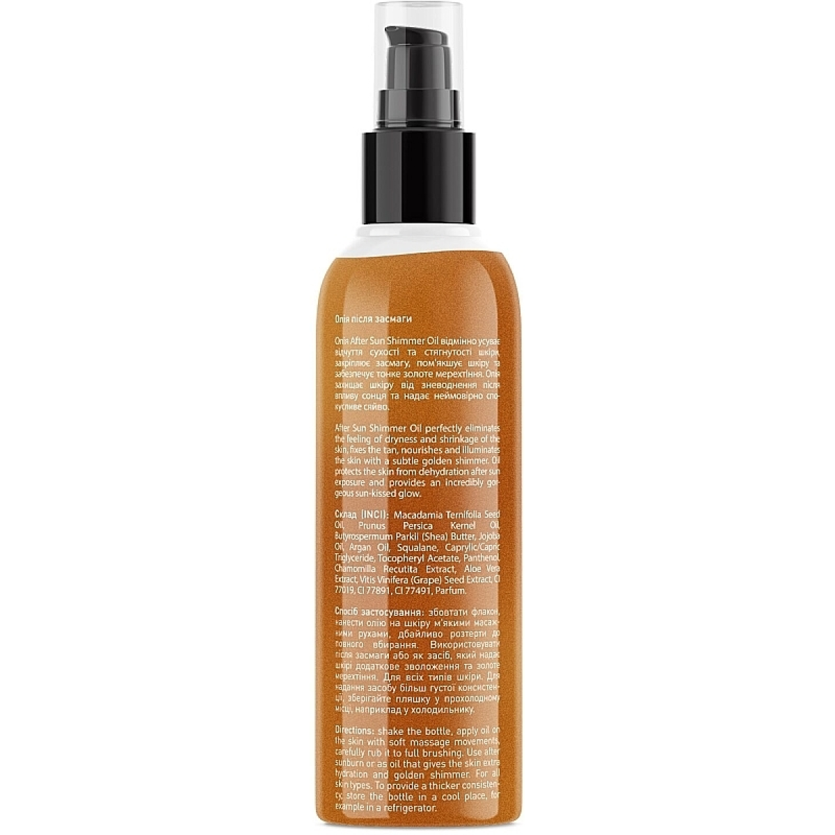 Завдяки вмісту цінних олій макадамії, ши, Аргани; екстрактів ромашки, алоє, виноградних кісточок і Д-пантенолу засіб відновлює природний гідроліпідний баланс епідермального шару, інтенсивно живить і ефективно регенерує його. Косметичний продукт також містить шимерні мікрочастинки, щоб надати шкірі розкішного сяйва зсередини.