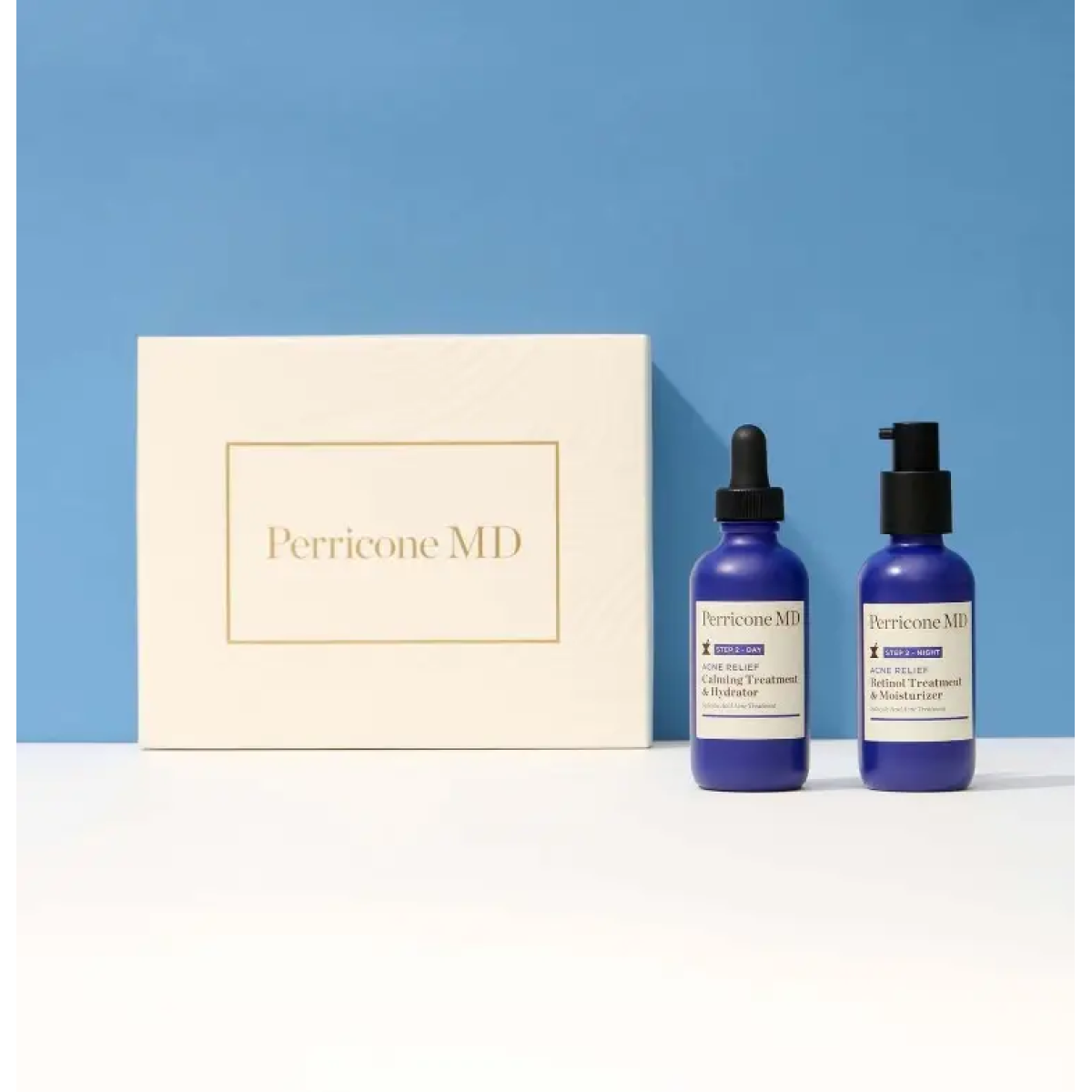 Склад набору: Заспокійливий гідратор для обличчя – Perricone MD Acne Relief Calming Treatment & Hydrator, 59 мл + Зволожувальний крем з ретинолом – Perricone MD Acne Relief Retinol Treatment & Moisturizer, 59 мл