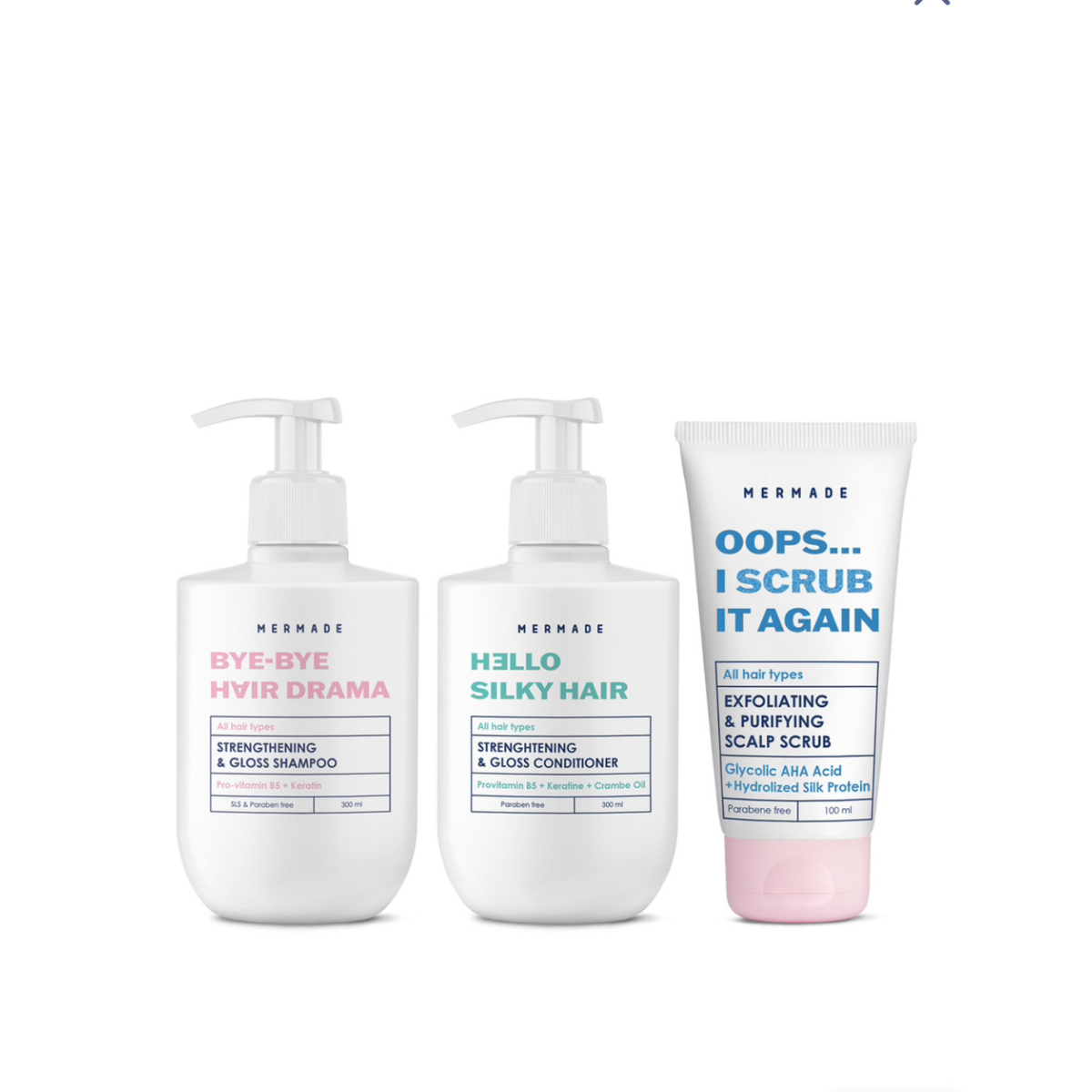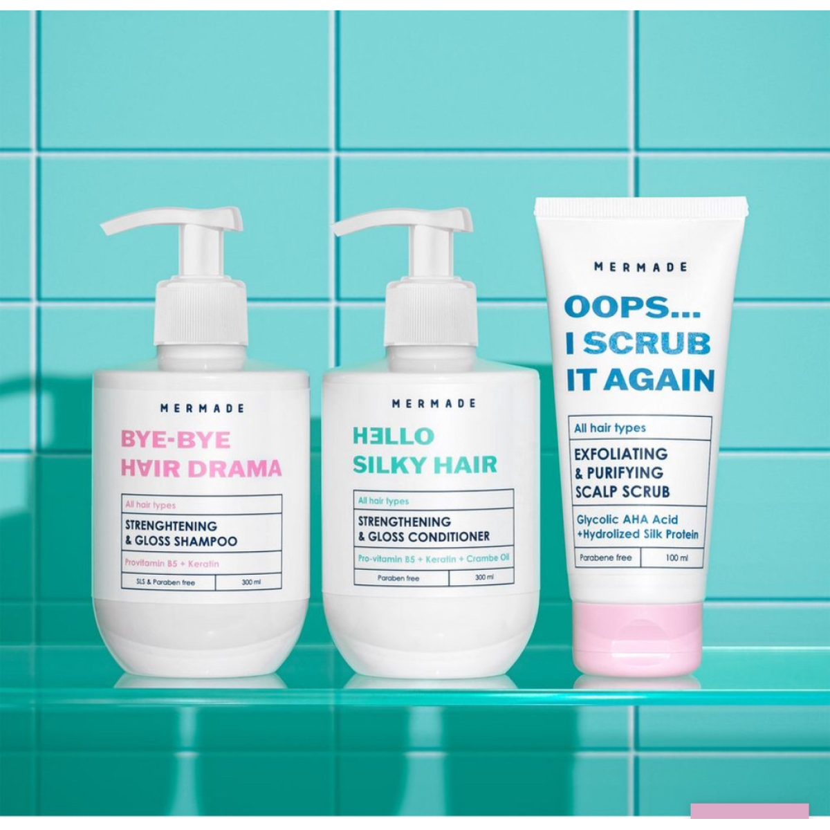 Комплекс-догляд для волосся та шкіри голови: шампунь + кондиціонер + пілінг MERMADE Keratin & Silk protein