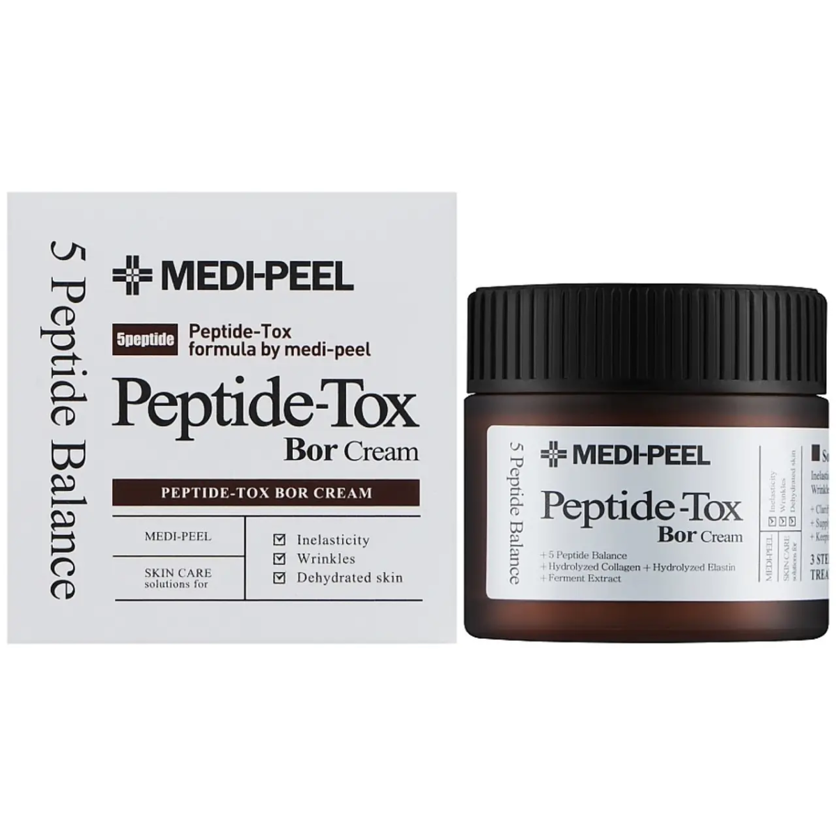 Medi Peel Bor Tox Peptide Cream є засобом для щоденного догляду за шкірою обличчя з метою усунення тих, хто з“явився, і запобігання появі нових проявів в“янення та старіння дерми. Крем Medi Peel Bor Tox Peptide Cream здійснює повноцінний ліфтинг-ефект, розслаблюючи волокна активних і рухливих м“язів обличчя, розгладжуючи мімічні зморшки та вікові прояви, пов“язані з втратою тонусу. Регулярне застосування крему дозволить не тільки освіжити і наситити шкірний покрив обличчя, але і запобігти збільшенню кількості зморшок і заломів, а також позбутися вже з“явилися. Крем Medi Peel Bor Tox Peptide Cream є повноцінним антиейдж засобом, рекомендованим як для превентивної підтримки молодості та свіжості шкіри, так і для використання володарками більш зрілої шкіри. Помітний ефект, що омолоджує, досягається в тому числі за рахунок унікального складу крему. Волюфілін допомагає м“язам розслабитися, вирівнює мікрорельєф. Гіалуронова кислота та пептиди нормалізують гідробаланс, попереджають трансдермальну втрату вологи. Кераміди реконструюють клітини епітелію, підвищують його пружність та еластичність. Аденозин уповільнює окислювальні процеси. Стовбурові клітини едельвейсу захищають від згубного впливу довкілля, сприяють виведенню вільних радикалів. Ботанічна олія ши знімає свербіж і подразнення. Купити цей крем, щоб максимально продовжити молодість вашої шкіри обличчя, можна навіть оптом за найбільш вигідними та привабливими цінами у нашому інтернет-магазині. Інструкція: на попередньо очищену і підготовлену шкіру обличчя (можливо після застосування сироватки для обличчя) нанесіть невелику кількість крему Medi peel bor tox peptide cream і легкими рухами розподіліть його вздовж масажних ліній обличчя. Рекомендується застосування крему двічі на день. Склад : Purified water, dipropyleneglycol, hydrogenated polyisobutene, butyleneglycol, triethylhexanoin, hydrolyzed collagen, Cetearyl alcohol, Shea butter, triglycerides Caprylic / capric acid, ethylhexylamine, 1,2-hexandio, 1,2-hexandio, , Edelweiss callus filtrate, yast ferment filtre lipidnogo fermentation, lacto-Bacillus / extract, pumpkin ferment, Lactobacillus / bean extract beans, Lactobacillus / extract granátовий ferment, Lactobacillus / fermented extract of horseradish root extract , Rosemary leaf extract of flowers / leaves / stems of thyme extract Anii Rubens, Bichurina gum-1, squalane, macadamia seed oil, oil jojoba seed extract, adenosine, root extract jimo (20 ppm), ceramide ceramide NS, NF ; Ceramide ASE, Ceramide Opi, trifluoropropyldimethycon, sodium polyacrylate, sodium acryloyldimethyltaurate copolymer , hydroxypropyl, hydroxyethylcellulose, malt extract, cholesterol, phytoscillicellulose, glycerylglycoside, phasil, sodium benzotriazolylbutylphenolsulfonate, sorbitan tristearate, tributyl citrate, acetylhexapeptide-8 (100 ppm), copper tripeptide-1 (100 ppm), oligopeptide-29 (50 ppm), oligopeptide-32 (50 ppm) ethylhexylglycerin, disodium EDTA, polysorbate 60, flavor