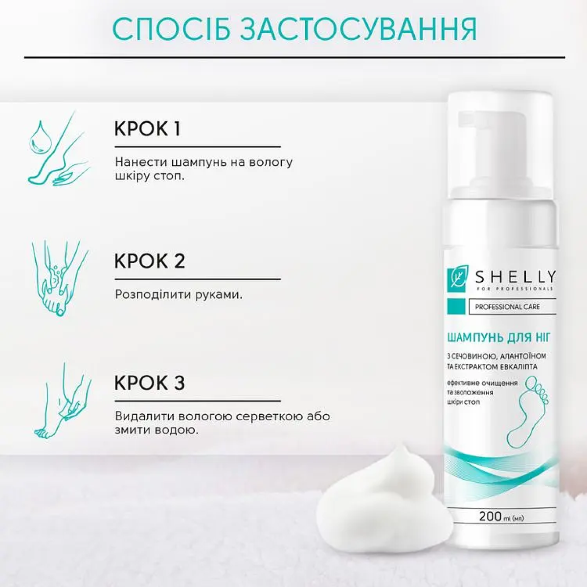 Спосіб застосування: нанести шампунь на вологу шкіру стоп та розподілити руками, після чого видалити вологою серветкою або змити водою.