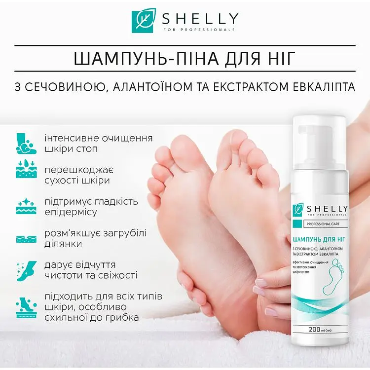 Шампунь-піна для ніг Shelly розроблений для інтенсивного очищення та догляду за шкірою стоп. Видаляє неприємний запах і бруд з ніг, роблячи їх чистими та свіжими. Засіб збагачений високоактивними компонентами, які ефективно впливають на суху, зневоднену шкіру.