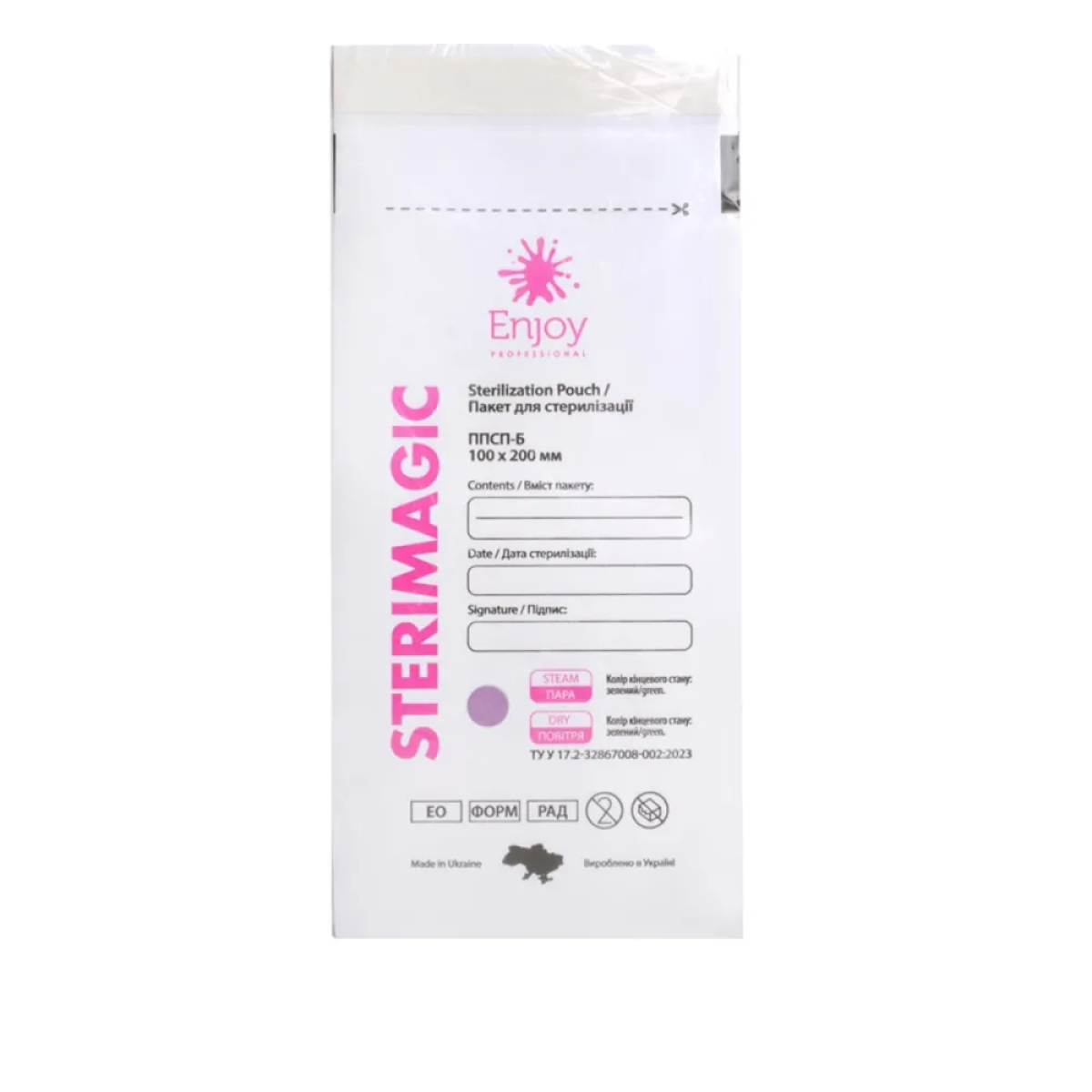 Пакет для стерилізації Enjoy Professional дозволяє надійно знезаражувати косметичні та медичні інструменти в автоклавах і сухожарових шафах. Він виготовлений з вологостійкого крафт-паперу, оснащений клейкою стрічкою і в закритому вигляді непроникний для патогенних мікроорганізмів. Вироби мають спеціальний індикатор 1 класу, що змінює колір після закінчення обробки.
